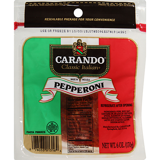 Carando Classic Italain Pre-Sliced Pepperoni gives you a head start on classic Italian flavor in a convenient pre-sliced pack. Made with a blend of pork and beef, this ready-to-eat pepperoni is seasoned with special spices including crushed red pepper and dark paprika to perfectly complement your favorite dishes. This mild pepperoni comes pre-sliced with no prep work required for quick meals and snacks. Enjoy the delicious taste of homemade pepperoni pizza with less work when you top your favorite dough and sauce with Carando Sliced Pepperoni and mozzarella cheese, or add it to pasta salad with olives, green peppers, tomatoes, cheese and Italian dressing for pepped-up flavor. The resealable packaging tears open easily and zips closed so your deli-sliced pepperoni stays fresh. Refrigerate any leftover pepperoni after you open the package to maintain freshness. One taste is all it takes to discover the authentic Italian heritage of Carando.