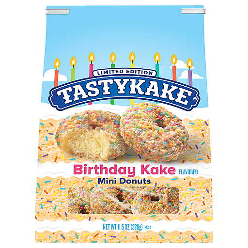 Tastykake®Birthday Kake Flavored Mini Donuts are here to delight your tastebuds and start a snack time celebration. Featuring a birthday cake inspired donut with confetti crunch topping, these mini donuts are perfect for celebrations big or small.Pair one or two Tastykake Birthday Kake Mini Donuts with your morning coffee for the perfect breakfast, or enjoy a few in the afternoon for a sweet snack. The convenient resealable bag locks freshness in so your donuts stay fluffy and moist for longer. Tastykake has baked iconic treats for over 100 years, creating tasty cakes, muffins, donuts, pastries, pies and more. With so many delicious and unique treats to choose from and so many happy snack-lovers, why would you ever choose another brand? Whether it is a quick bite on the go or a reward after a long day, at Tastykake, we take snacking seriously, and our products are here to satisfy. Choose Tastykake and accept no substitutes®.